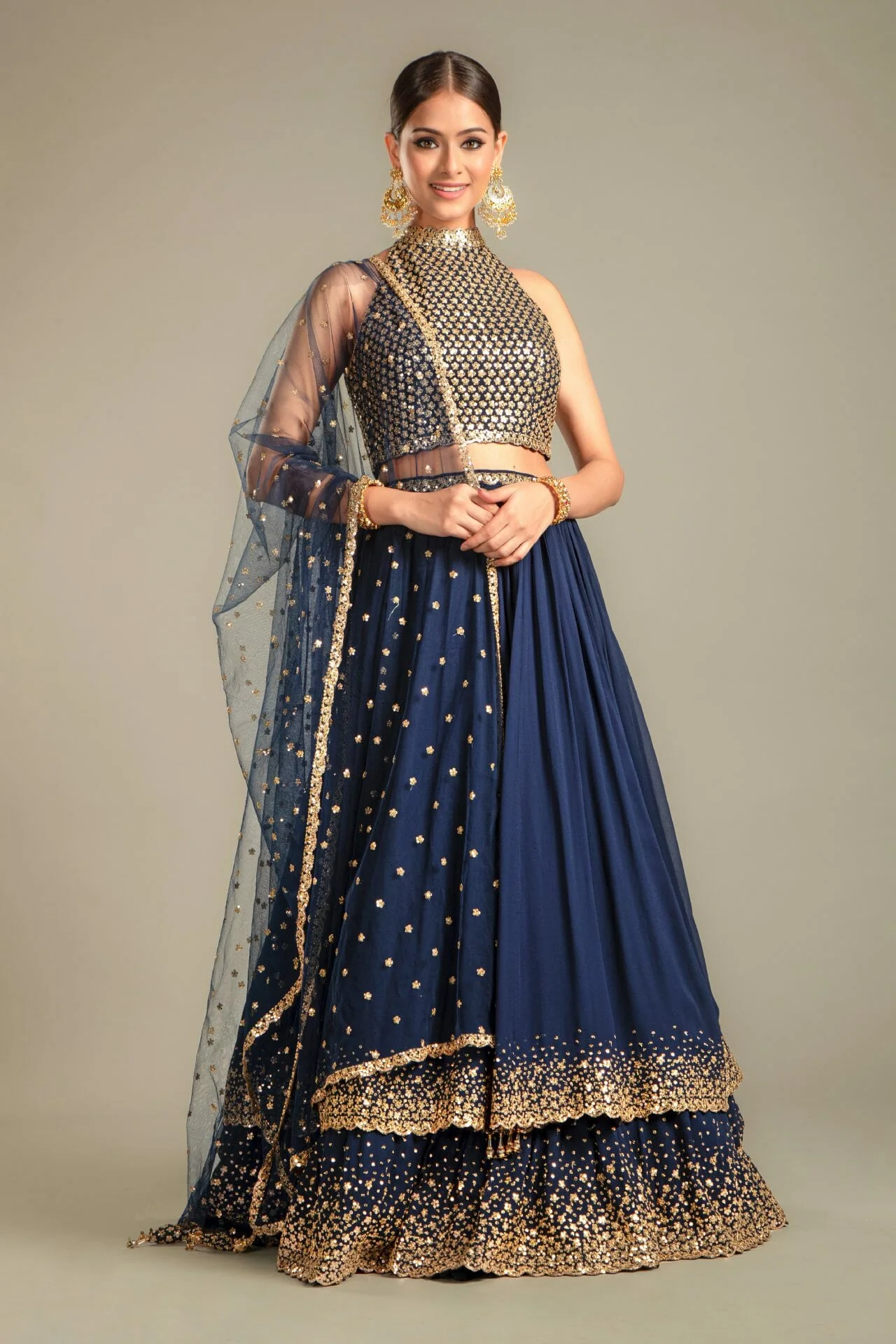 Upgrade your wedding trousseau with this magnificent Navy Blue Georgette Lehenga. The lehenga has a double layered silhouette, that is adorned with sequins work. This lehenga is desinged with an incut sleeves, heavily embroidered with sequins. The set also comes with a sequins work net duppatta.