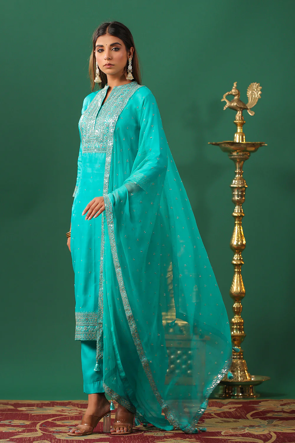 - The sequins embroidery on this suit material is a work of art in itself. Floral motifs, intricate patterns, and delicate detailing come together to create a masterpiece that reflects the rich heritage of Indian craftsmanship. Each stitch tells a story of dedication and creativity, making this ensemble truly exceptional.